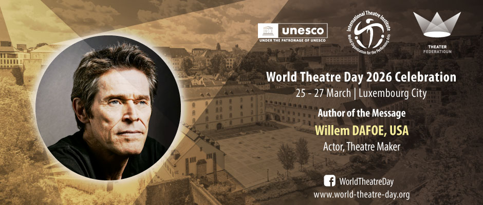 Anul acesta, mesajul de Ziua Mondială a Teatrului este transmis de renumitul actor și creator de teatru Willem Dafoe, o personalitate marcantă a scenei contemporane internaționale.