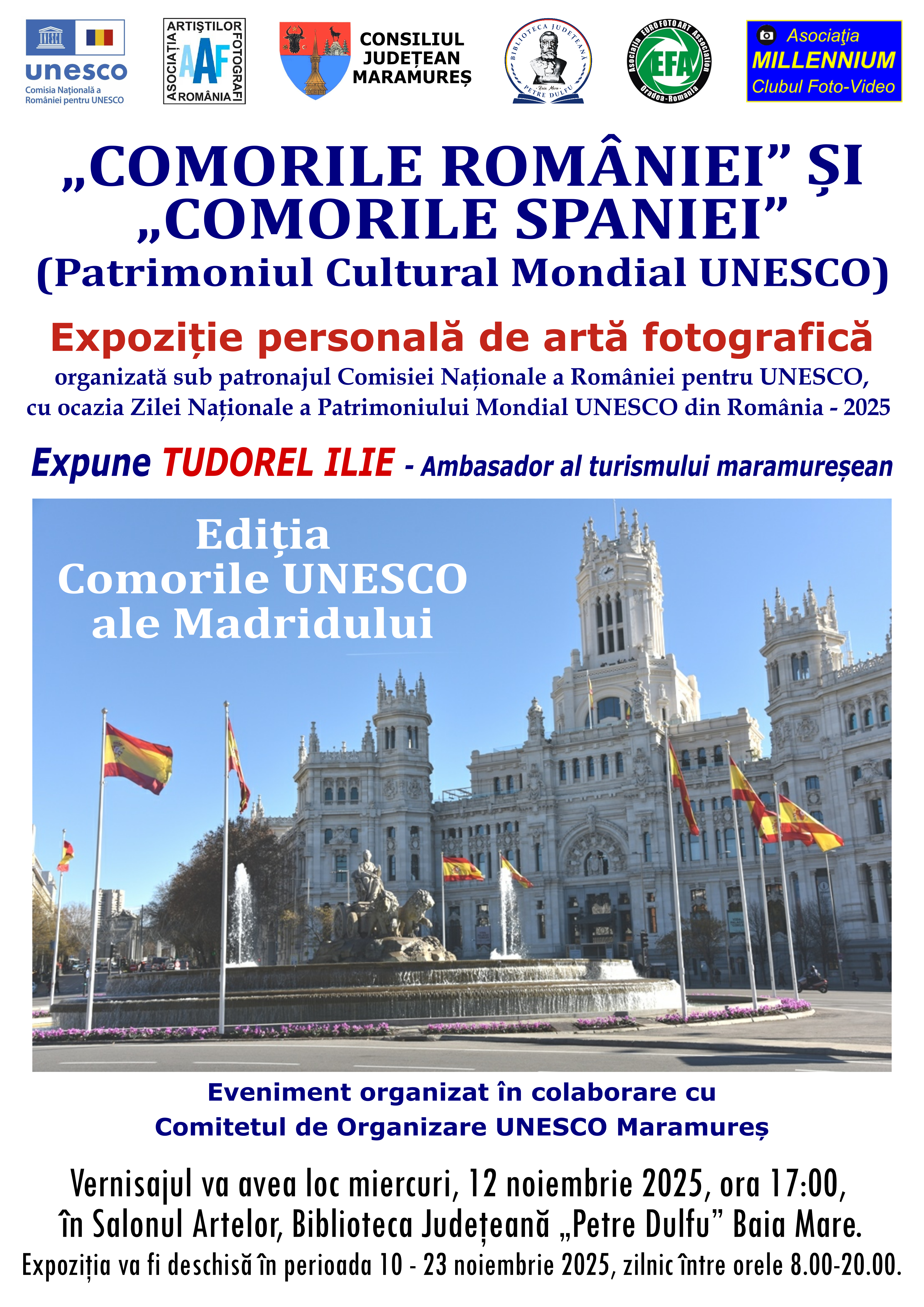 Articol publicat pe 11-11-2025Biblioteca Județeană „Petre Dulfu” din Baia Mare va găzdui, miercuri, 12 noiembrie 2025, ora 17.00, vernisajul expoziției „Comorile României” și „Comorile Spaniei” – ediția „Comorile UNESCO ale Madridului”, eveniment organizat sub patronajul Comisiei Naționale a României pentru UNESCO (CNR-UNESCO). Manifestarea are loc cu prilejul Zilei Naționale a Patrimoniului Mondial UNESCO din România, sărbătorită anual la data de 16 noiembrie, și este realizată în colaborare cu Comitetul de Organizare UNESCO pentru monumentele istorice din județul Maramureș – coordonat de lect. univ. dr. Natalia Lazăr, Universitatea Tehnică Cluj-Napoca, Centrul Universitar Nord Baia Mare.